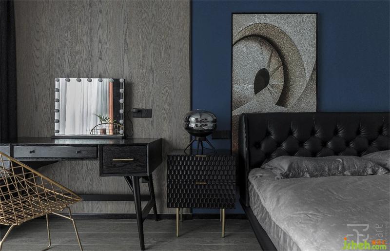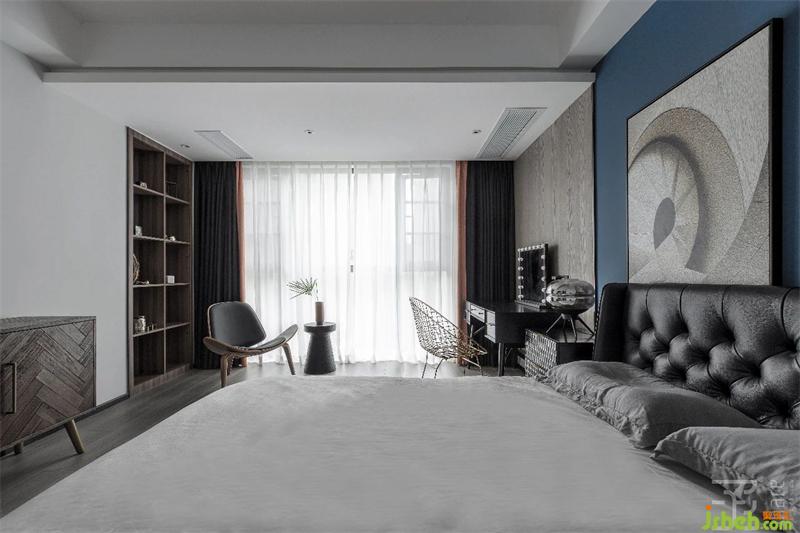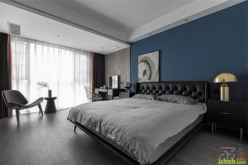 獨立的衣帽間使主臥空間得到了大大的解放,舒適的休閑區(qū),撞色的窗簾配色與床頭背景相呼應,內嵌的格子柜充分利用了墻壁空間,還滿足了儲物。
