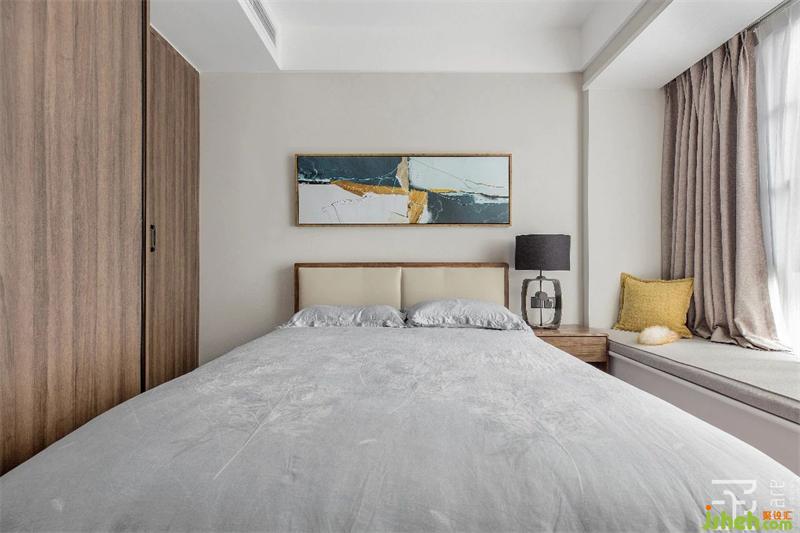 長輩房充分利用空間增加了儲物區(qū),飄窗做了軟墊,父母可以坐在上面休息、看書等;整體采用明亮的色調更增加了溫馨的感覺。