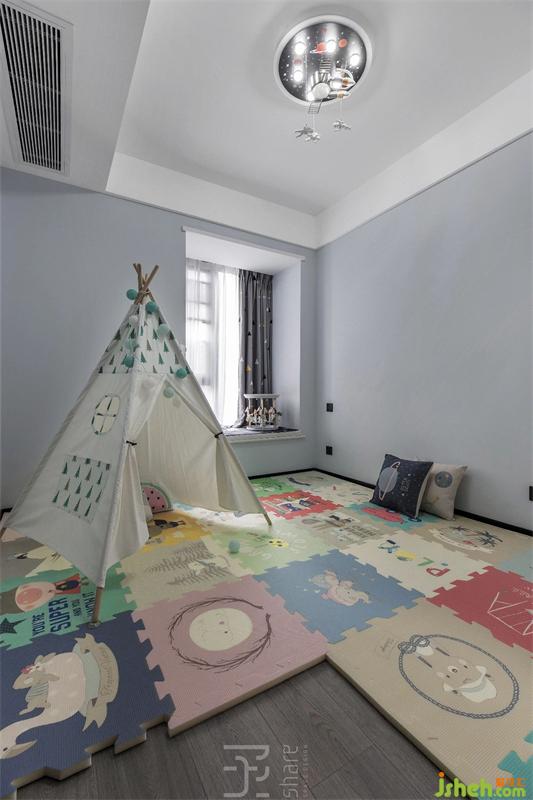 兒童房暫時沒有做空間布局,而是敞開做了寶寶的玩??臻g;因為寶寶還比較小,暫時不會自己單獨居??;同時,房間也保留了該有的基礎功能,等寶寶長大了直接擺進家具就可以使用。
