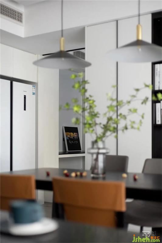 冰箱、書柜、餐桌,巧妙的融合在一個空間里,不僅省空間,也讓家人有更多的時間相處。沙發(fā)后的矮柜,既能儲物,又恰到好處的隔開2個空間。整體與客廳相連,擴大視野,但又是可以獨立操作空間。
