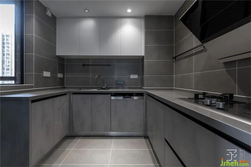 灰色的廚房空間,難得的U型櫥柜,將冰箱放到餐廳,空出更多的廚房操作空間。那些我們不曾說出口的愛,有一半藏在了廚房的時光碎片里,忙碌是,期待更是。