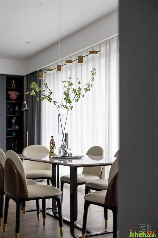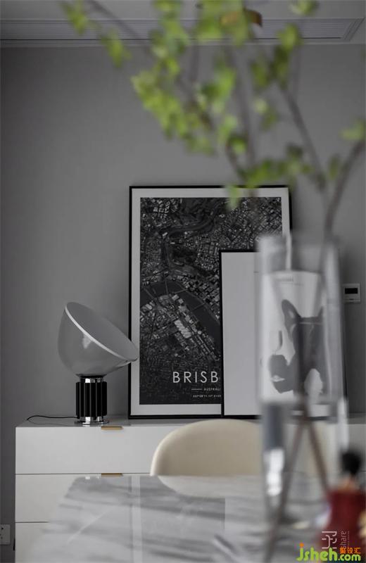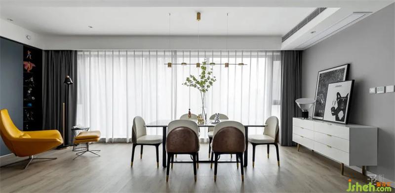 通過對原房結(jié)構(gòu)的分析,原房的空間采光和通風(fēng)相對不錯,客餐廳區(qū)域有個超級大的陽臺連在一起,可塑性較強。通過對空間的調(diào)整,將大落地窗旁的空間設(shè)置為餐廳和閱讀區(qū)。
