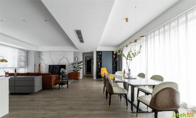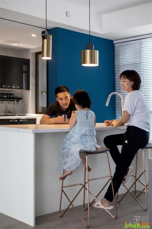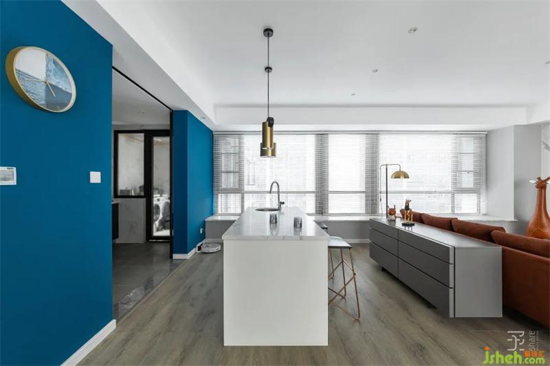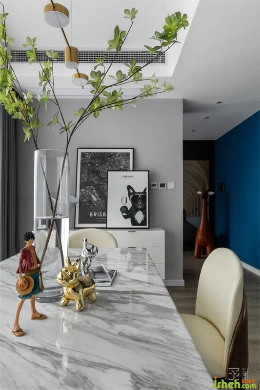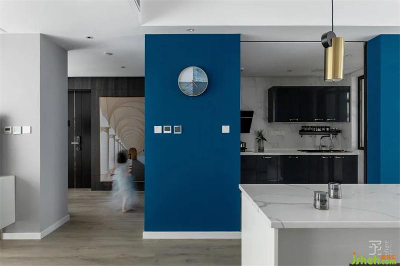 本案是一套170平米的三居室住宅,簡約時尚是整個設(shè)計的基調(diào)??臻g以黑白灰色系作主色調(diào),大面積深藍色的使用,瞬間讓相對單一色系的空間彰顯出一種不凡的氣場,藍色象征著勇氣、冷靜、理智和永不言棄,體現(xiàn)著藍先生家庭的精神。