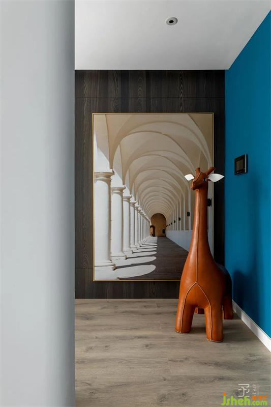 軟萌的橙色小鹿搭配深邃的歐式建筑過(guò)道,深藍(lán)的乳膠漆墻面銜接深灰色的木質(zhì)面板,無(wú)形中加深了空間的縱深感,帶給空間無(wú)限的可能。生命中許多吉光片羽,我只愿蓬勃生活在此時(shí)此刻,去決定怎么愛,怎么活。
