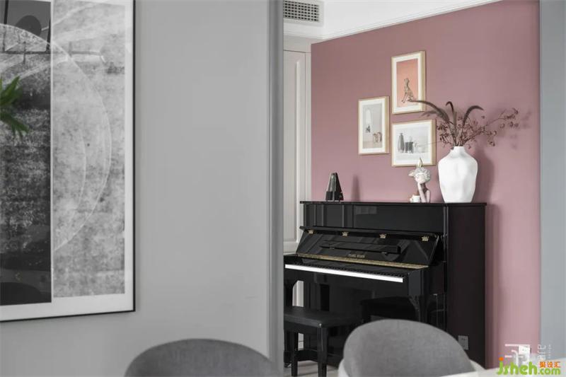 淡淡的粉色與女兒房相互響應(yīng),優(yōu)雅的鋼琴搭配質(zhì)感的花瓶擺件,在金色邊框的裝飾畫的映襯下格外美好,隱藏的玻璃推拉門使得琴聲悠揚(yáng)的充滿整個(gè)空間。
