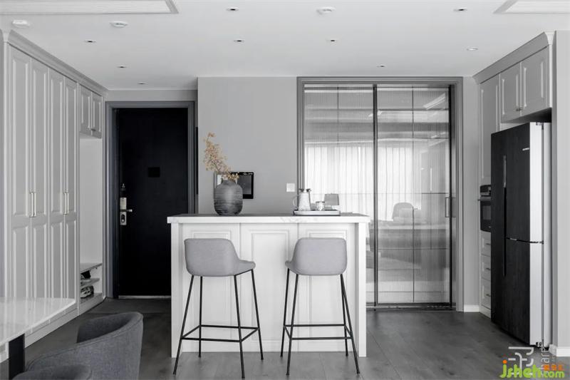 成都家居設(shè)計(jì)師將原本的廚房區(qū)域向生活陽臺展開,使得中西廚在空間中完美融合,而生活陽臺區(qū)域被巧妙得隱藏在諾大的客廳陽臺一角。擴(kuò)大了的可隱藏的廚房門使廚房如同開放式廚房一樣融合在整個(gè)公共空間內(nèi)。西廚的設(shè)計(jì)與公共空間風(fēng)格相輔相成,早餐的開始,從廚房到西廚圍繞著吧臺吃著簡餐,一家人的理想生活徐徐展開。
