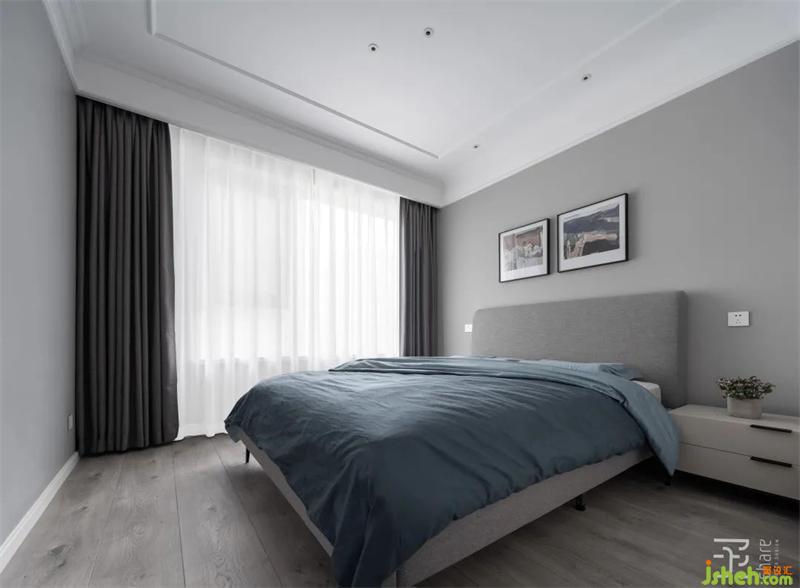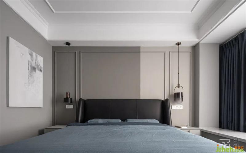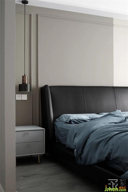 臥室墻面是干凈的淺灰色,深灰色的床與邊柜加以點(diǎn)綴,中和淺灰的輕盈。無主燈的設(shè)計(jì)不但能滿足視覺效果,同時(shí)也能滿足審美需求。