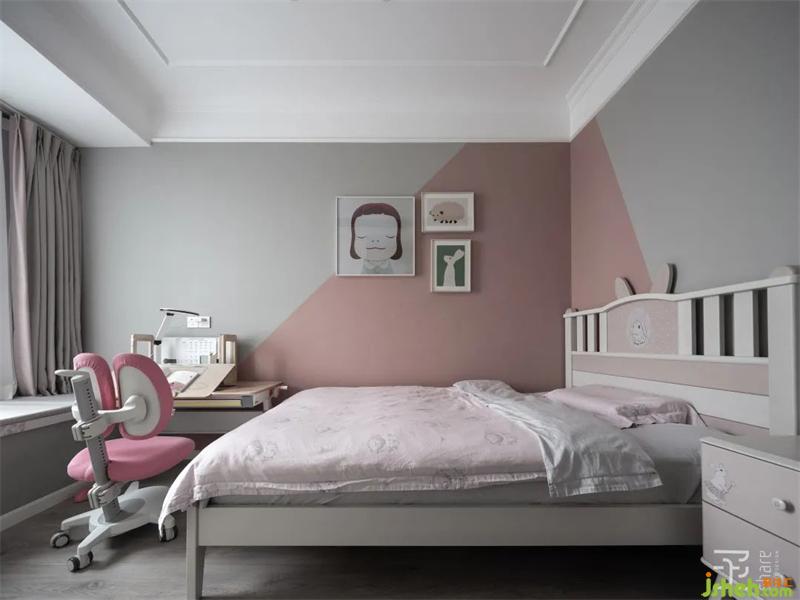 稚嫩少女心的粉灰撞色搭配可愛的床頭以及童趣的裝飾畫,讓人想要回歸童年。