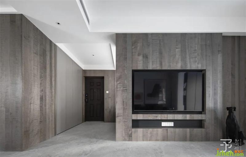 電視機背景墻摒棄了傳統(tǒng)電視機柜的擺放方式,采用嵌入式設(shè)計。大面積的暖灰色楓木水波KD板以純粹的色彩和木材肌理,賦予空間一份自然之氣,營造了一種天然的安定感。
