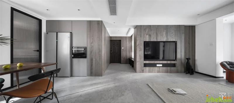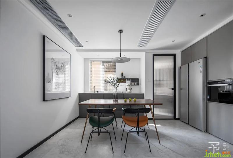 成都裝修設(shè)計(jì)的整體性貫穿于整個(gè)空間,餐廳同樣延續(xù)了暖灰色木質(zhì)飾面的設(shè)計(jì)。增加的開放式西廚臺(tái)面、嵌入式冰箱、蒸烤箱一體設(shè)計(jì)解決了廚房空間過(guò)小導(dǎo)致的功能不足的問(wèn)題。