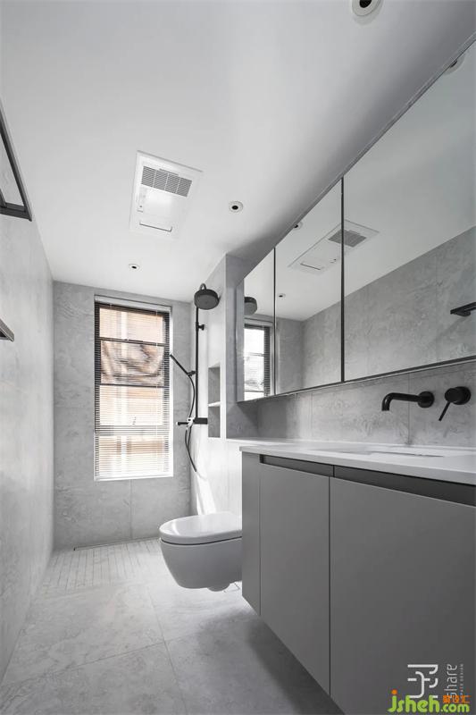 衛(wèi)生間空間墻面與地面統(tǒng)一采用淺灰色磚,顯得整體簡(jiǎn)潔利落。為方便寶寶洗澡,衛(wèi)生間淋浴區(qū)取消了傳統(tǒng)的玻璃隔斷設(shè)計(jì)。設(shè)計(jì)回歸最本質(zhì)的人居初心,空間中的隱形地漏、壁掛馬桶、淋浴區(qū)壁龕、地面防滑設(shè)計(jì)無(wú)不體現(xiàn)出設(shè)計(jì)的人性化細(xì)節(jié)。