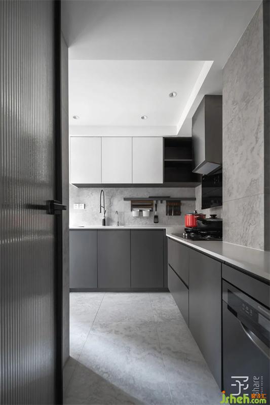 設(shè)計(jì)師將原有的廚房空間打開作為西廚區(qū)域,生活陽(yáng)臺(tái)改為了中式廚房,擴(kuò)大了廚房面積的同時(shí)解決了原廚房無(wú)采光的問(wèn)題。增加的臺(tái)面方便了業(yè)主放置家電。高低臺(tái)面的設(shè)計(jì)方便洗切與炒菜,到頂?shù)牡豕裨黾恿藦N房?jī)?chǔ)物空間。被譽(yù)為“收納之王“的BASISTEM廚房掛件的運(yùn)用讓廚房空間更整潔、有序。人性化的感應(yīng)燈設(shè)計(jì)提升了生活的品質(zhì)感。