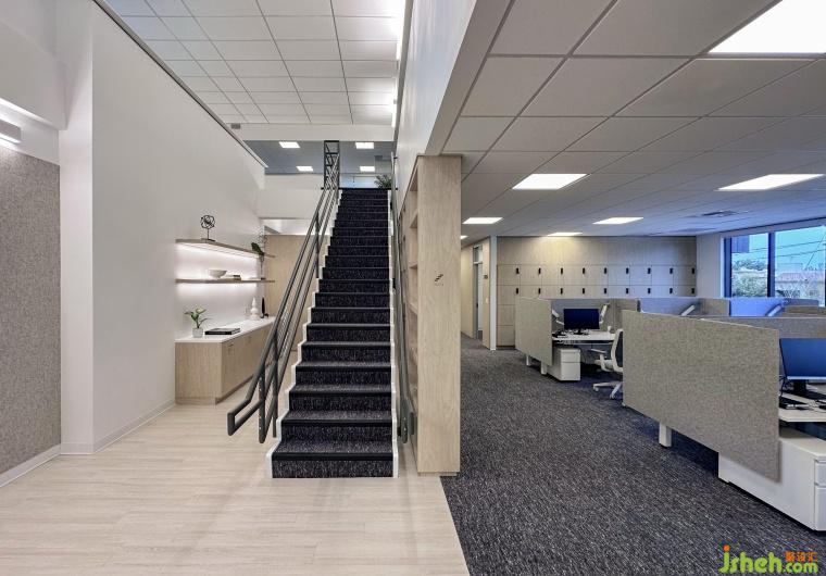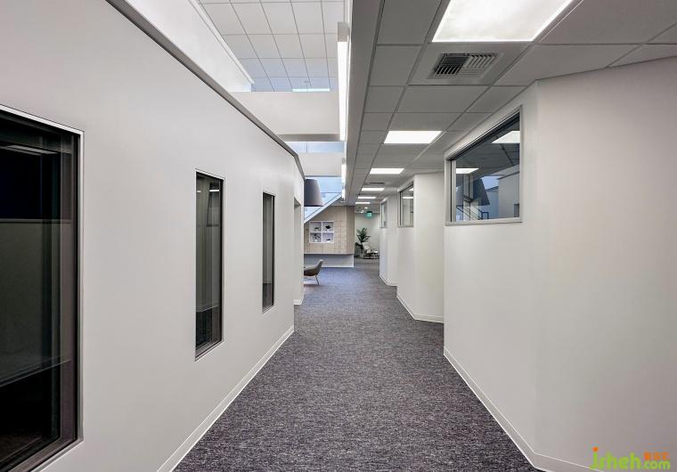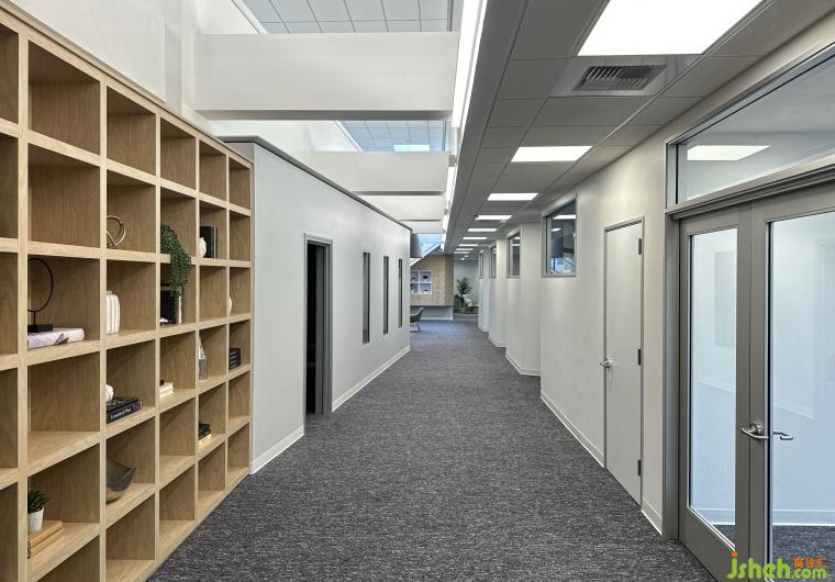 走廊的地面材料與墻壁的變化,形成了視覺上的層次分明,從而營造出一種“漸進式”的空間節(jié)奏感。辦公空間設計地面和墻壁的銜接處選用不同質感的材料,使得光線在其表面產生了柔和的反射與折射,光影隨時間流動,賦予走廊一種動態(tài)的生命力。