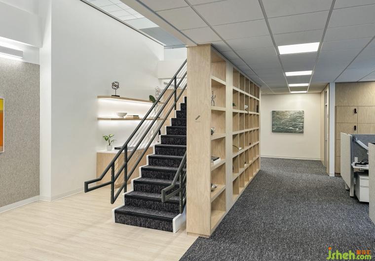 樓梯不僅是連接上下兩層的通道,我們還在其旁還巧妙地融入了打印區(qū)和一座高聳的木質書架,為這一通常平凡的空間增添了實用性與審美價值。淺木色調與周圍灰白色的環(huán)境和諧相融,營造出一種統(tǒng)一而和諧的視覺效果,增強了空間的整體感。這些精心的設計細節(jié)使得走廊不再僅僅是一個簡單的通道,而是成為了一個連接各個功能區(qū)域的“過渡空間”。通過有節(jié)奏的設計語言,整個辦公空間被巧妙地串聯(lián)起來,賦予了空間更加豐富的層次感和動態(tài)的節(jié)奏。