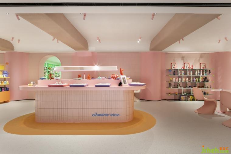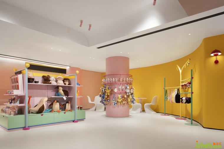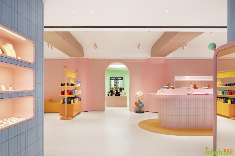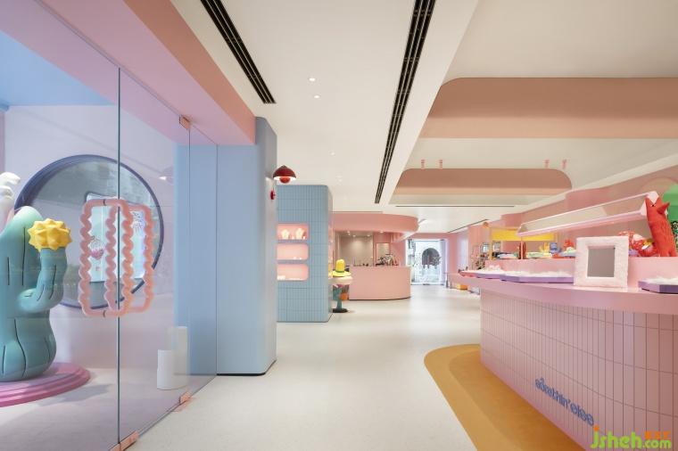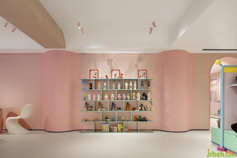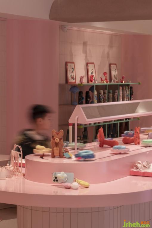 玩偶被懸掛在柱子上展示,波浪的墻面夾雜著錯(cuò)落的展架,有的展架長了“腳”,有的則長了“角”。我們也讓這些道具的設(shè)計(jì)徹底與空間的夢(mèng)境融為一體。