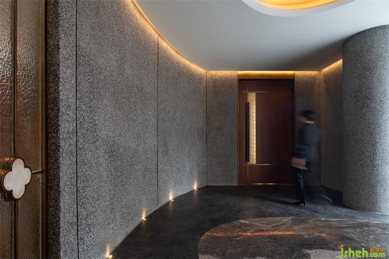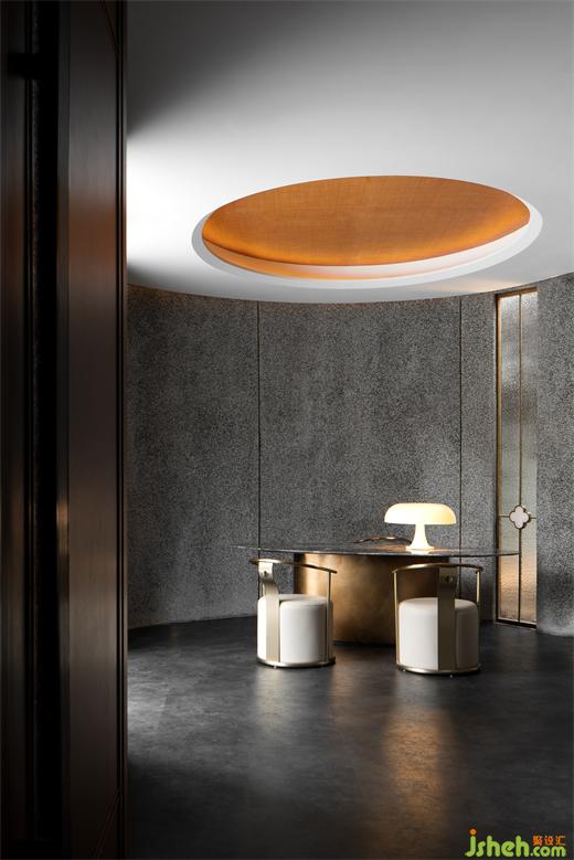 雨樹主張去設(shè)計一種既溫婉柔和又端莊秀麗的門廳空間,餐廳設(shè)計以低技的水洗石結(jié)合曲面的空間形態(tài),營造了初見山茶「隱于市」的優(yōu)雅印象。