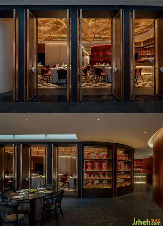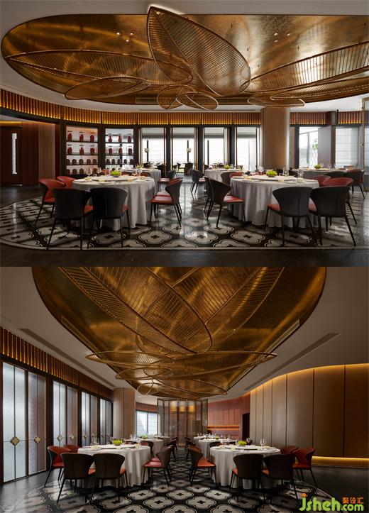 內(nèi)廳暗紅為主調(diào),如一朵熱烈的山茶花,嬌而不俗,優(yōu)雅沈靜。天花上巨型的葉片裝置,各自生長。呼應外廳的同時,亦為內(nèi)廳增添了生氣。