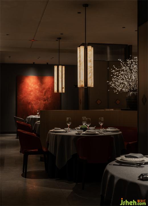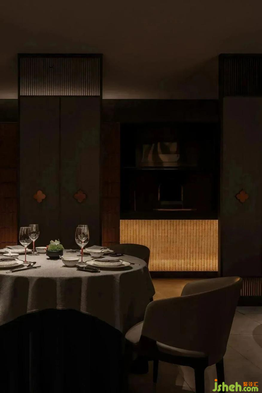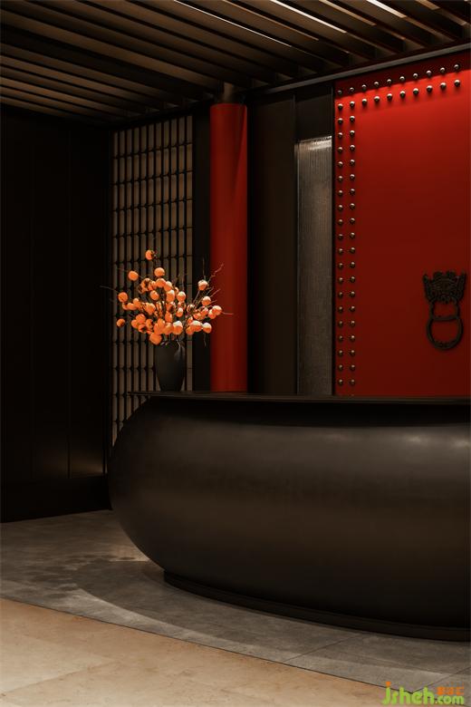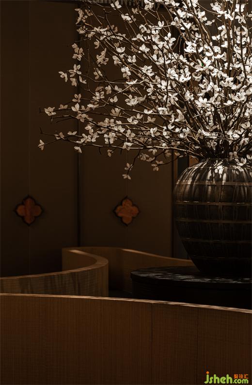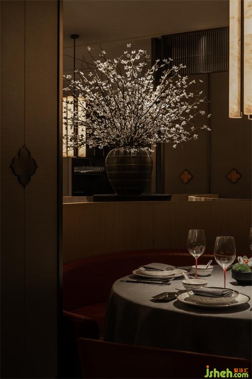 橘色燈光的玻璃磚、溫暖的紅磚、柿花與金屬板結合的皮藝屏風,設計師有序的將其置于空間之中,交相重疊。