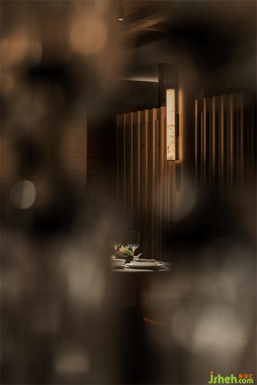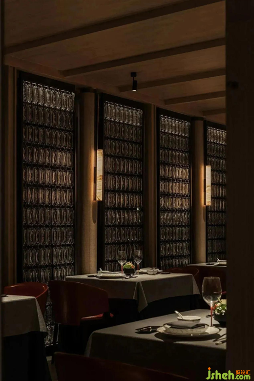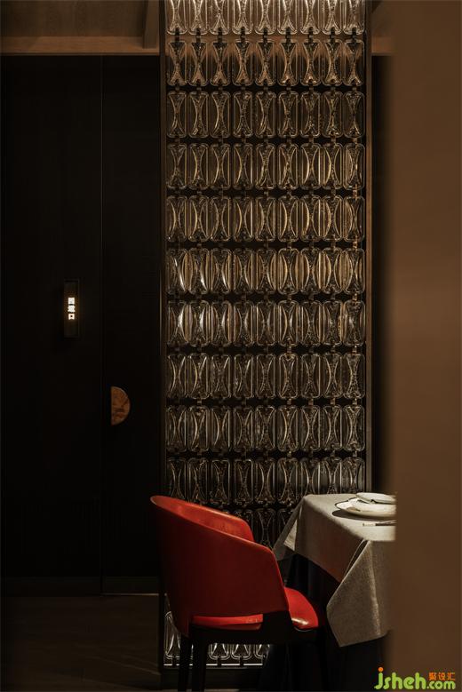 移步換景,數(shù)塊透光玻璃屏風(fēng)與沉穩(wěn)的木調(diào)形成對(duì)稱,卡座燈光之間的相互呼應(yīng),給予場域尺度感和溫暖的氛圍。