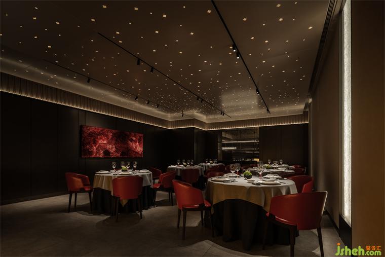 宴會(huì)廳頂部則隱藏著另一個(gè)世界,漫天星光以柿花的形態(tài)呈現(xiàn),稍顯不真實(shí)的朦朧浪漫之感,行走其中,仿佛和現(xiàn)實(shí)生活中的鋼筋水泥相隔離,實(shí)現(xiàn)獨(dú)特的就餐體驗(yàn)。