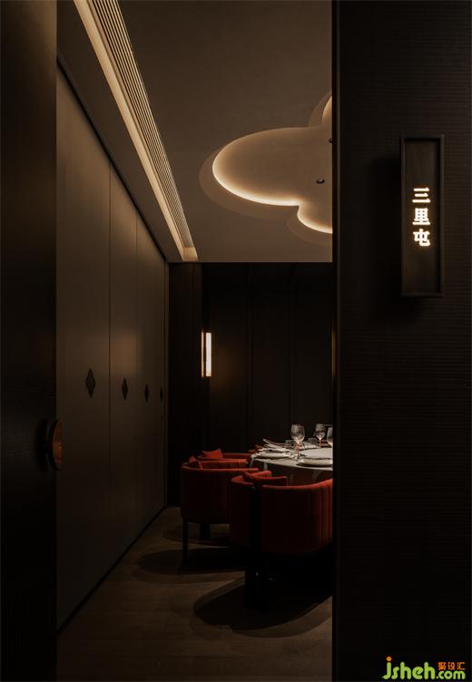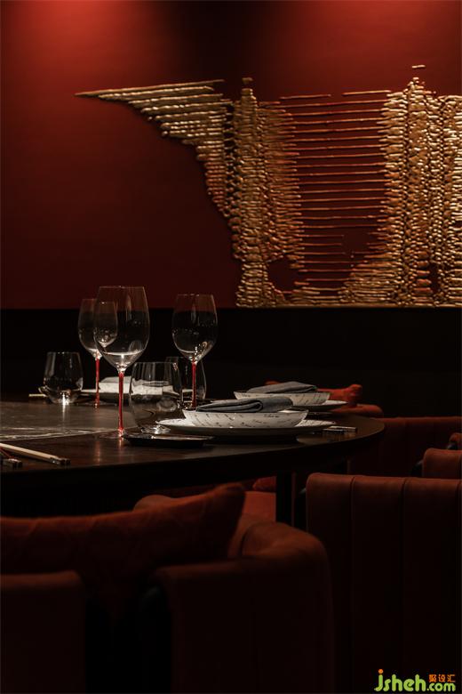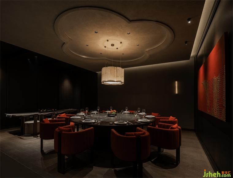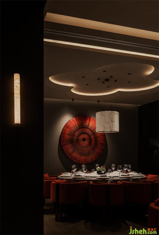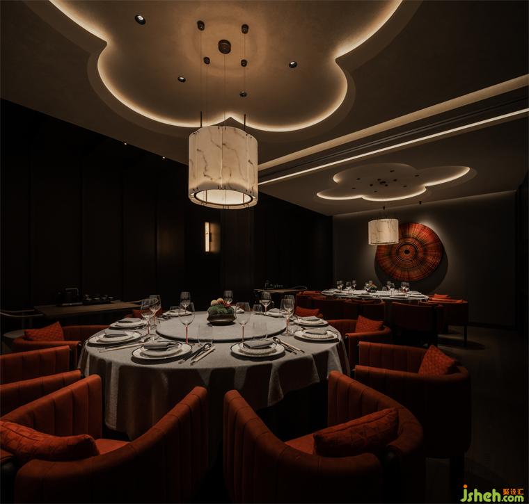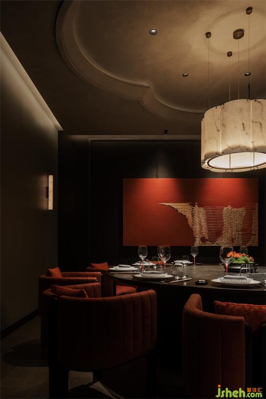節(jié)奏清晰的空間動(dòng)線排布,串聯(lián)為彼此貫通的區(qū)域。餐廳設(shè)計(jì)包房?jī)?nèi)的柿花形態(tài)頂部和云石材質(zhì)的吊燈交相輝映,為空間注入別樣的藝術(shù)氛圍。室內(nèi)的藝術(shù)品和紅色鋸齒紋椅搭配,給予包房?jī)?nèi)獨(dú)特的個(gè)性美學(xué),讓其成為一個(gè)神秘的小世界。