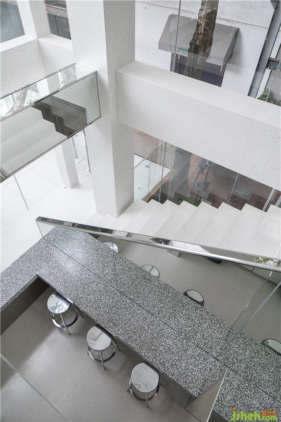 為了給員工提供一個舒適、放松的辦公場所,設(shè)計方大量運(yùn)用玻璃、水磨石、鏡面不銹鋼等時尚的建筑元素,解決20年老樓空間小、采光差等問題,探討人與空間、人與環(huán)境和諧共生的現(xiàn)代化辦公解決方案。