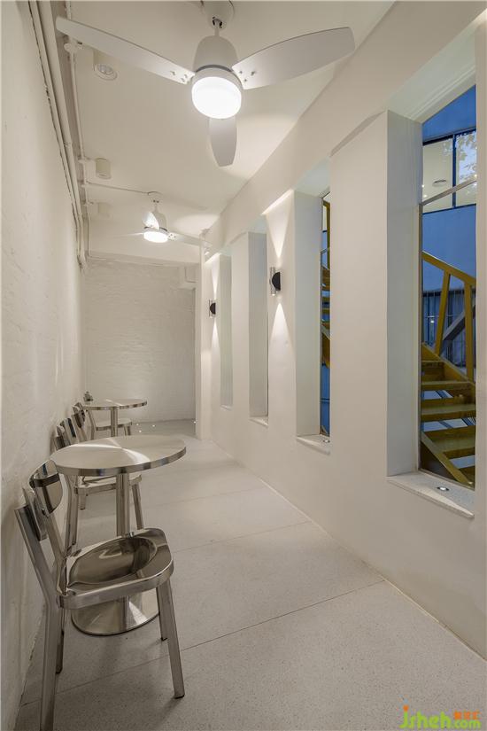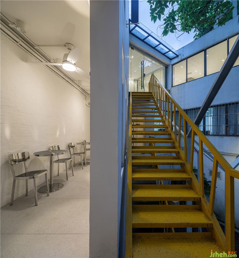 The fire stairs at the door of the meeting room retain the original bright yellow color, creating a visual surprise. The fire stairway is directly connected to the independent corridor of the mezzanine, and is arranged as a smoking area. Make full use of the corner space to create a diversified rest area and reserve an "inspiration space" for employees.