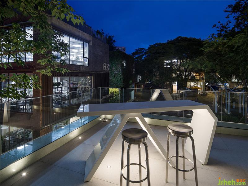 Outside the water bar area on the second floor is a small garden terrace. An artificial stone is used to create the installation artwork integrated into the building appearance, and the combination of lighting can add some feeling of fashionable style, at the same time, it has the function of bar.