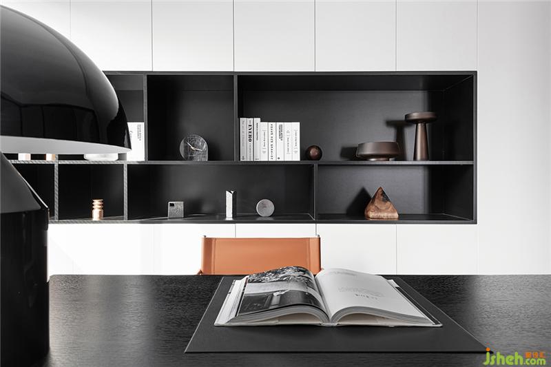 百葉簾的隱約開合、抽象藝術(shù)掛畫的存在以及圓形燈球的交匯相應(yīng),給書房空間注入別樣的氛圍。