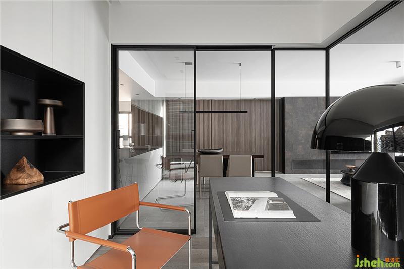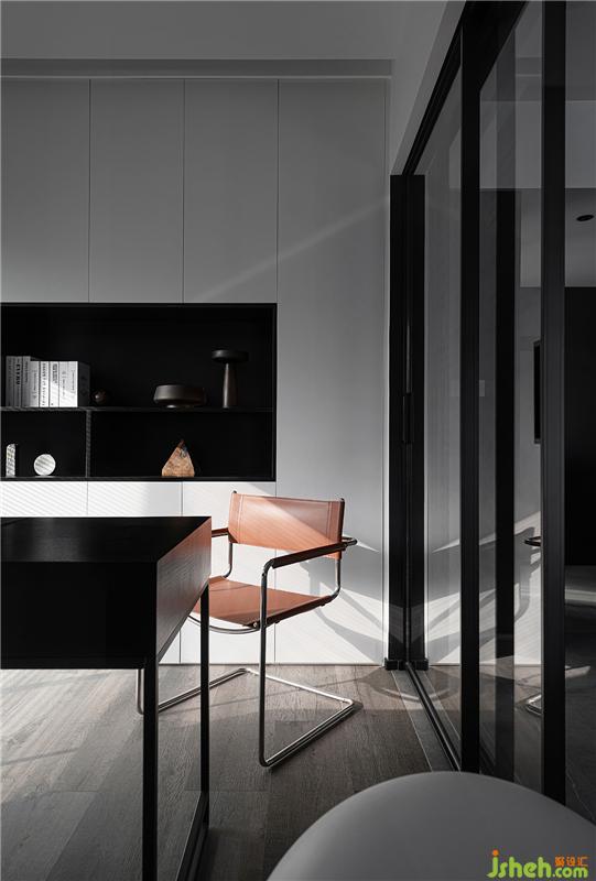 利用玻璃移門圍合書房空間,實現(xiàn)視覺最大化,收納需求較多,設(shè)計一整面的收納+局部展示柜,美化實用功能,保證空間的整潔、完整,半開放的層板設(shè)計更是增加了空間之間的通透性和藝術(shù)性。