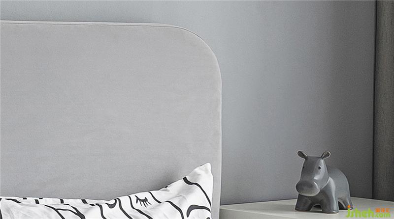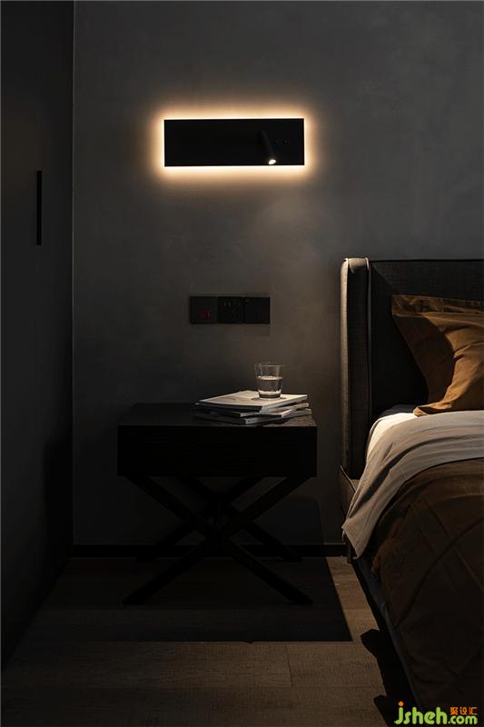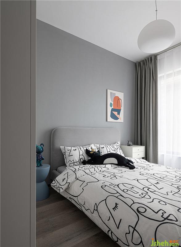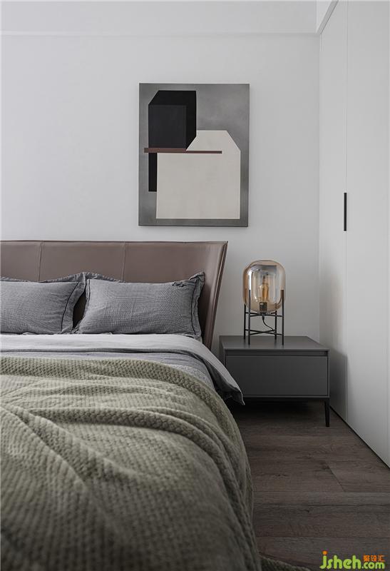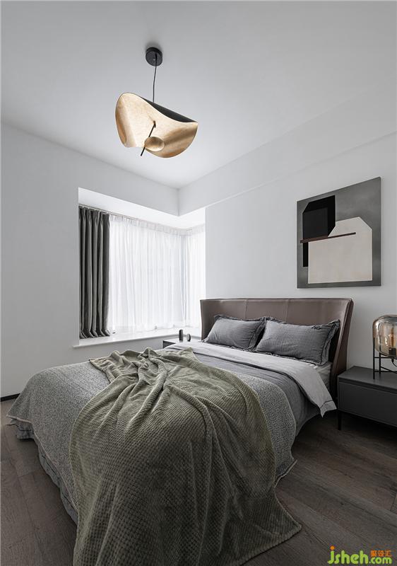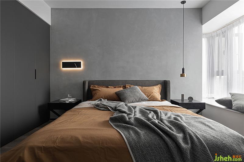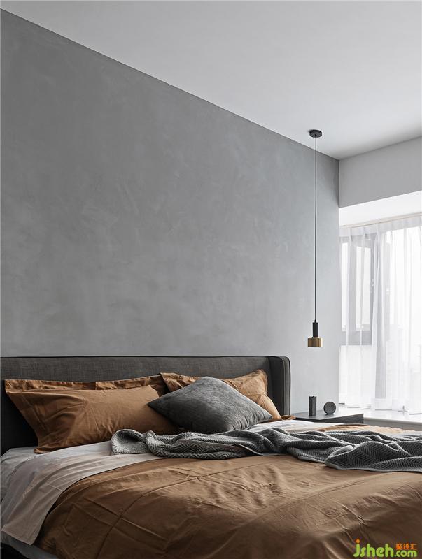 水泥漆、啞光衣柜、亞麻布樣的床頭,不同層次的灰度顏色和自身肌理的呈現(xiàn),加上色彩濃烈的床品,延續(xù)了客廳的設(shè)計構(gòu)架,避免了空間的色彩單一,同時也為主臥增加一絲暖意,床頭的壁燈及小型吊燈讓空間多一份情調(diào)。
