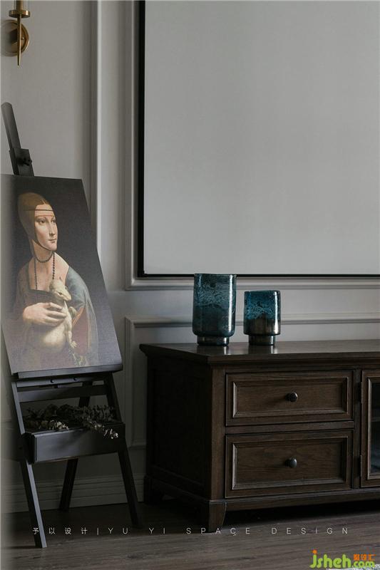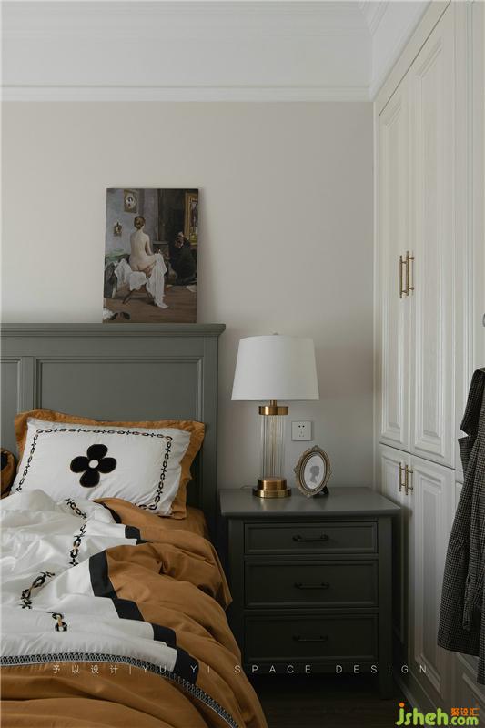 金色質(zhì)感的衣柜把手、金色質(zhì)感元素的臺燈、油畫裝飾畫與棕黃色床品進(jìn)行組合搭配,格外的愜意。掛在柜門前方的衣服也成為了畫面中裝飾的一部分,自然、隨性。