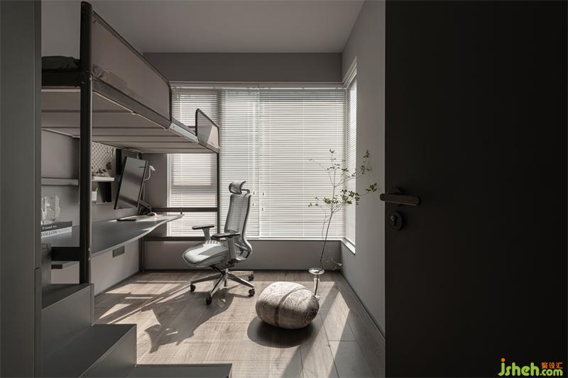 兒童房通過梯柜與高床垂直空間的利用,利用下方空間設(shè)計辦公書桌區(qū)域,并且釋放出兒童房地面空間,充分利用每一平空間尺寸。