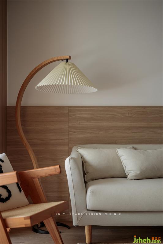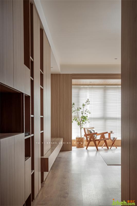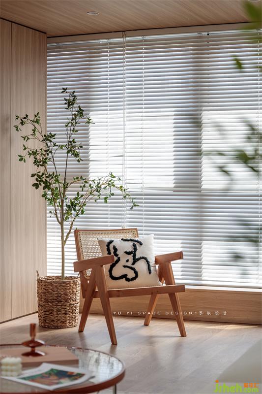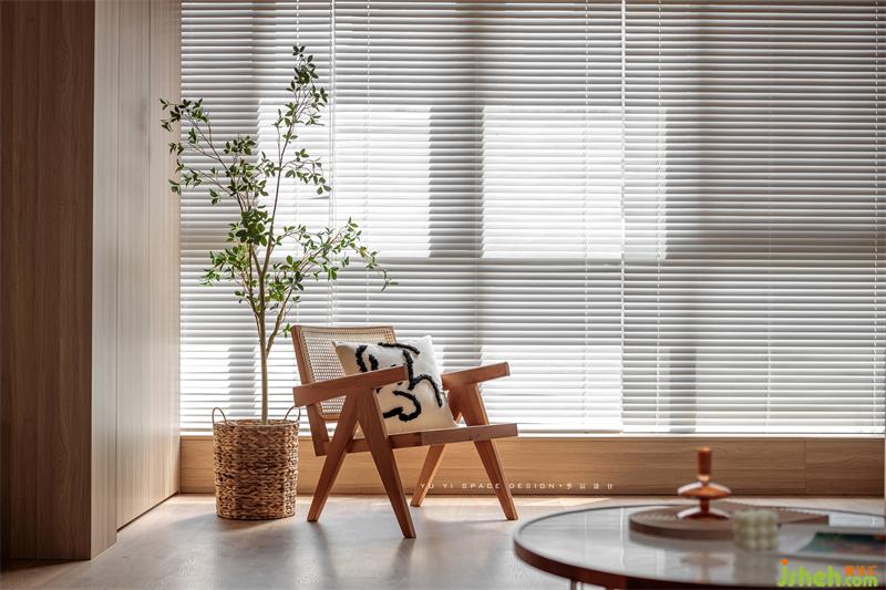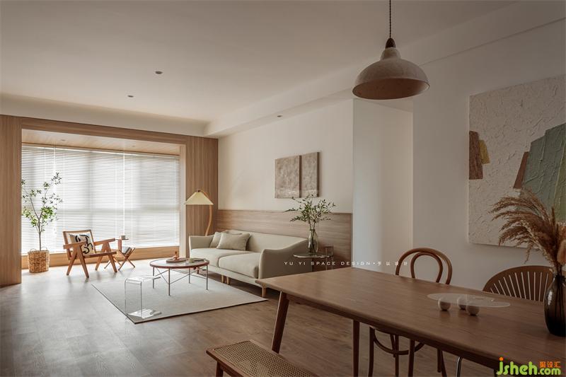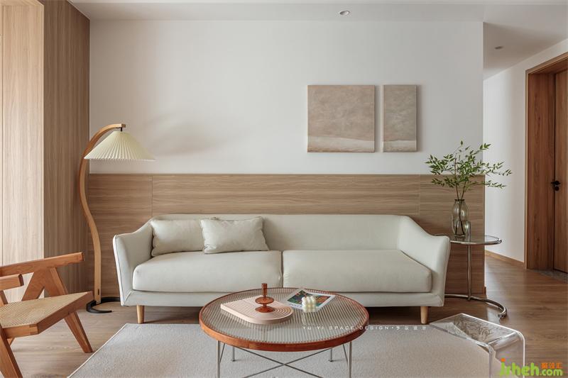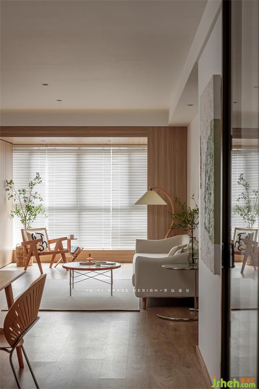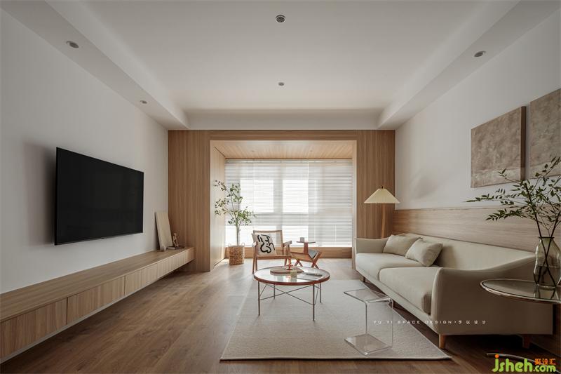 The semi-high wall panels of TV cabinets and sofas are interwoven with the "wooden box" of the balcony to express the structural form and make the space relevant. The continuation of wood makes the space more tension and ductility