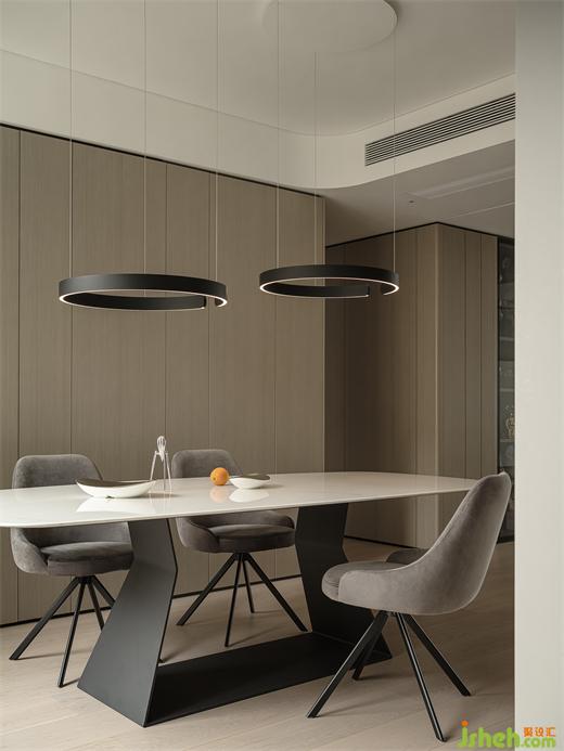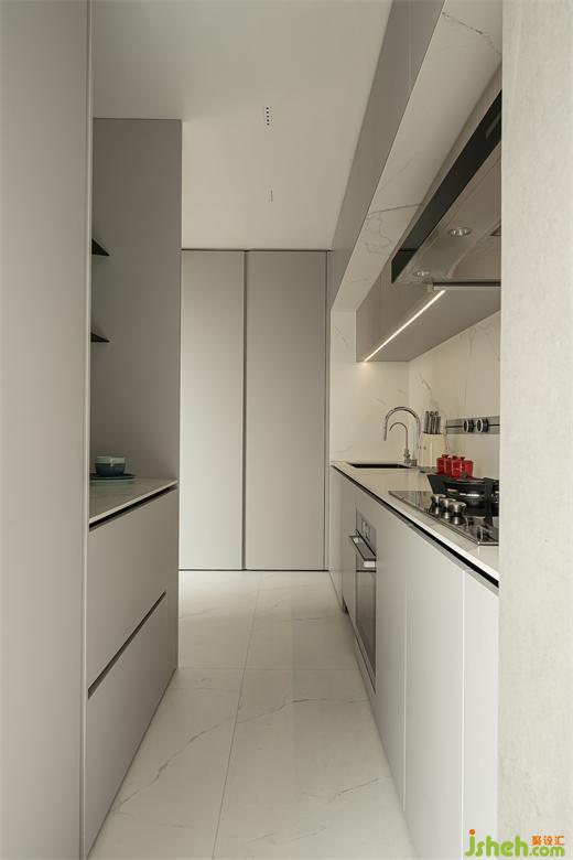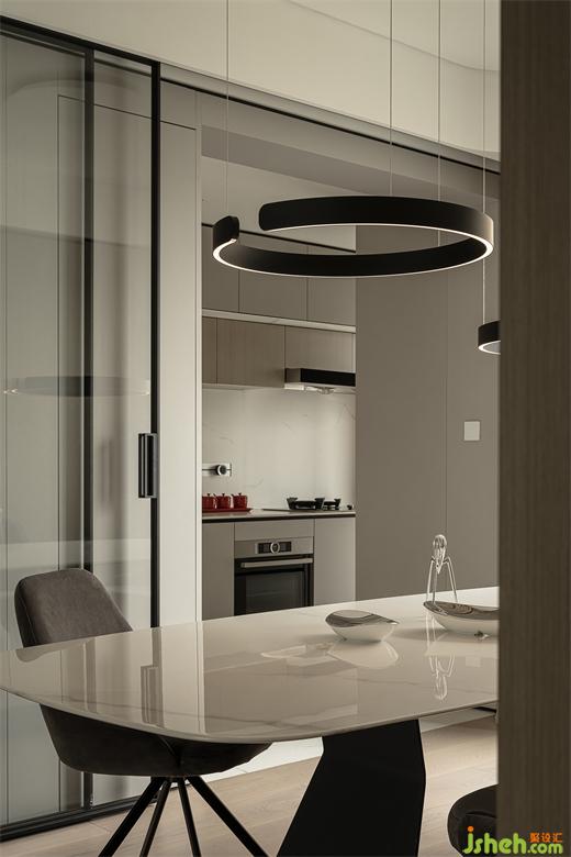 餐廚空間運(yùn)用大面積的巖板,在結(jié)合整體氛圍滿足功能使用的同時(shí),讓空間的形體表現(xiàn)得更有節(jié)奏感。