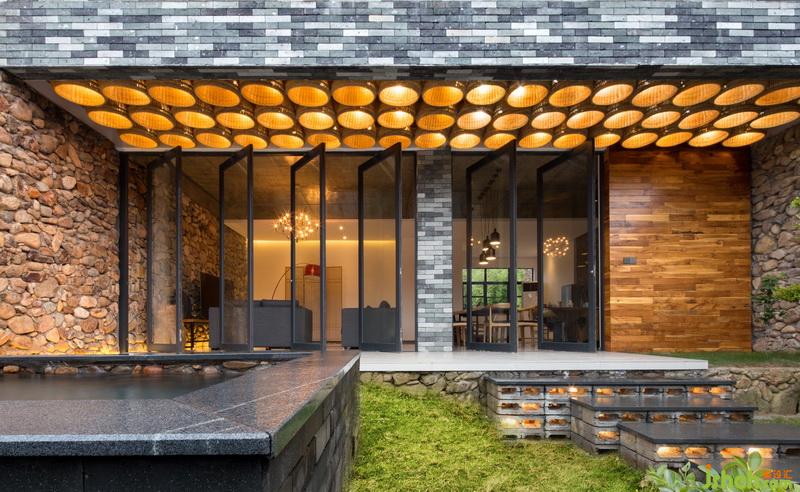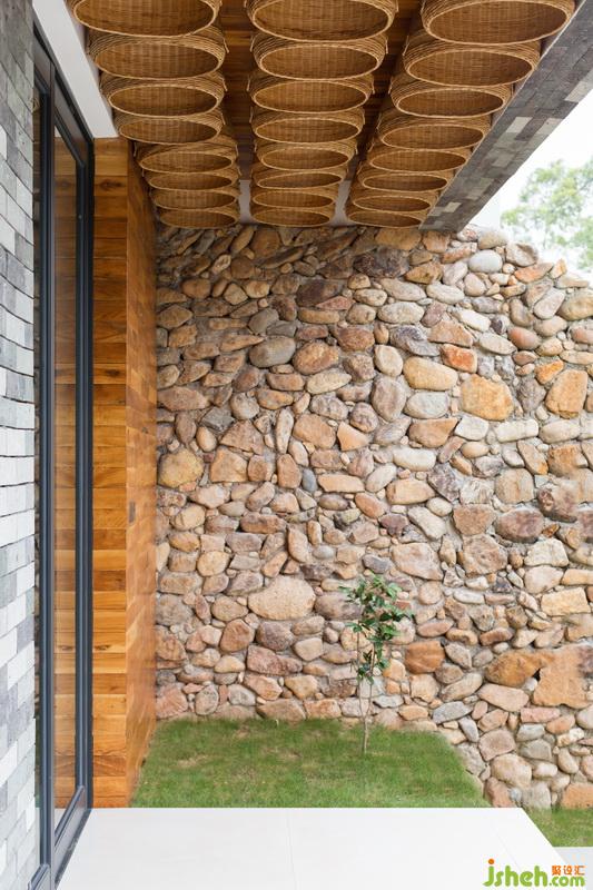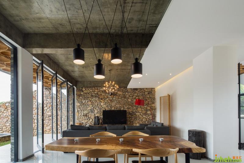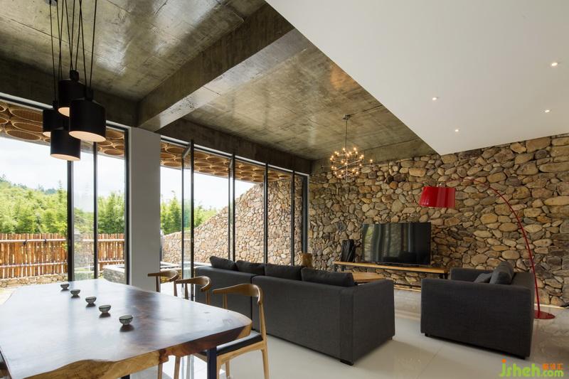 本案位于一個(gè)山清水秀的溫泉村,旨在為珠三角的游客提供一個(gè)可以家庭朋友周末聚會(huì)休閑的所在。塑造一個(gè)和諧的人與大自然的關(guān)系,以現(xiàn)代人的需求為出發(fā)點(diǎn)來(lái)組織空間動(dòng)線,外觀室內(nèi)設(shè)計(jì)師借鑒傳統(tǒng)的元素。最大限度的體驗(yàn)當(dāng)?shù)氐年?yáng)光空氣景色,感受不一樣的安靜時(shí)光!兩棟聯(lián)排別墅利用弧線山墻造成錯(cuò)位的層次感,粉墻黛瓦喚醒人們對(duì)傳統(tǒng)建筑美感的向往。別致的樓梯通道安排只為了每間房都能享受到穿堂風(fēng)的愜意和落地窗前滿眼的竹林。室內(nèi)設(shè)計(jì)師門前河里撈上來(lái)的石頭砌成的客廳主題墻,從室內(nèi)一直延伸到花園,打破了室內(nèi)外空間的隔閡,提高了體驗(yàn)的舒適度。