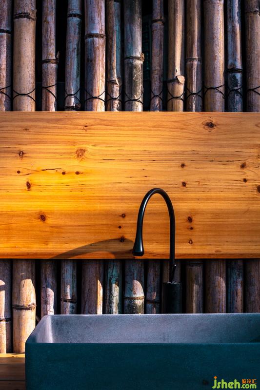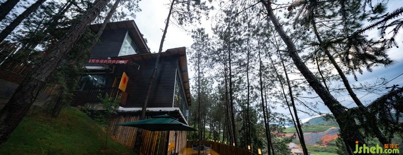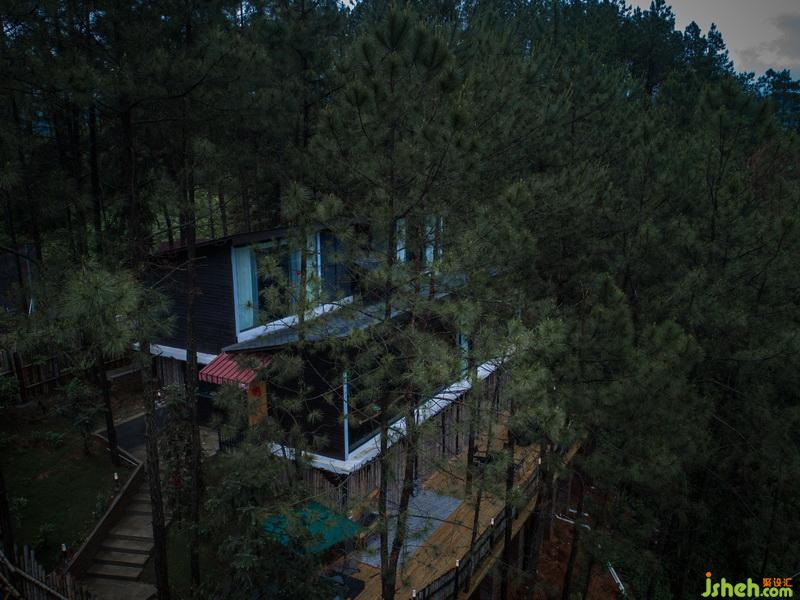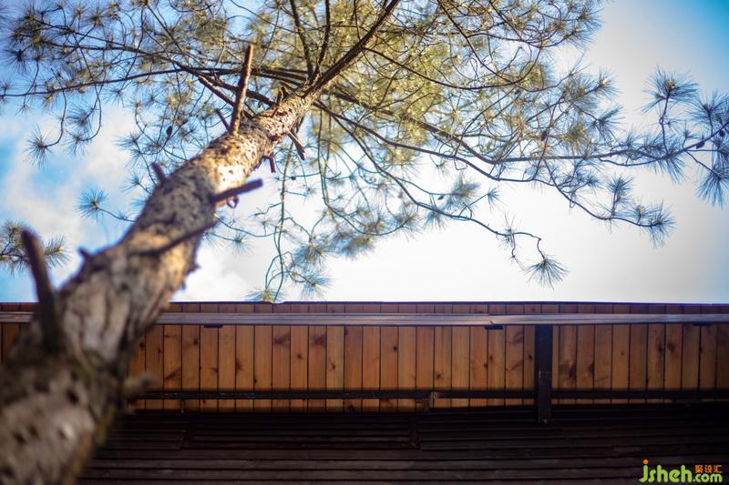 入眼可見,設(shè)計(jì)師選用的主材為本地杉板,經(jīng)過(guò)手工燒炭處理表面。除了防蟲防霉還因?yàn)槠渥匀坏暮谏|(zhì)感把整個(gè)房子隱藏在松林間,樹梢上。