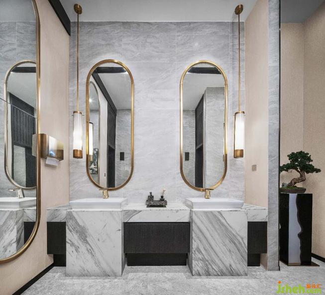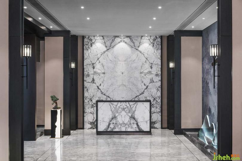 主要材料| 云多拉灰大理石、寒江雪大理石、范特西灰大理石、黑檀木飾面、黑鈦拉絲不銹鋼、手繪壁紙、水紋玻璃等
