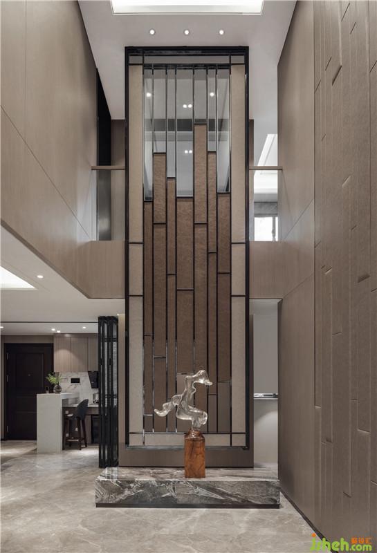 入口雕塑以流動回歸的形式展現(xiàn),底部大地色的根基象征著包容體現(xiàn)著穩(wěn)重,上部晶石回旋扭動的形態(tài)表現(xiàn)了生命的流動感。從而讓我們看到生長與回歸的意識形態(tài),與最終回歸本心的意境。玄關處承接上下,勾連生活起居空間。