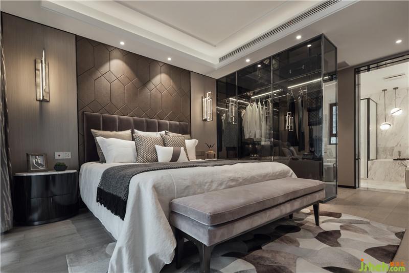 主臥以灰駝色為主調(diào),同色調(diào)軟硬裝營造溫暖沉實的氛圍。通透茶玻衣柜靈動了整個空間,流露出淡淡簡致奢華之氣。