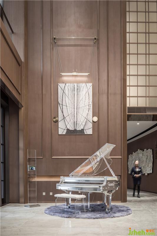 高聳有序的半透書架、通透的琉璃藝術(shù)玻璃提升了接待區(qū)的儀式感;與金屬裝置相結(jié)合的藝術(shù)掛畫、超現(xiàn)代的獨特透明設(shè)計的KAWAI鋼琴、呼應(yīng)著雕塑家Lynn Chadwick 林·查德偉的《穿斗篷的步行者》一系列的雕塑作品,契合美學(xué)生活博物館的主題,漫步在書海中,傾聽著音樂,讓快節(jié)奏的城市生活,慢下來...