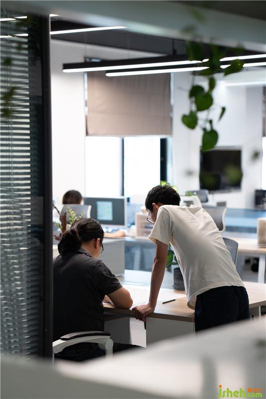 內(nèi)部工作環(huán)境的動(dòng)線利用原有的建筑結(jié)構(gòu)柱制作的功能貯藏柜體分為辦公區(qū)、材料區(qū)及大型會(huì)議區(qū)。兩者間可根據(jù)功能需求封閉形成獨(dú)立功能區(qū)或打開成為交互開放工作空間,整個(gè)辦公空間在功能前提下穿插流動(dòng),形同無界。