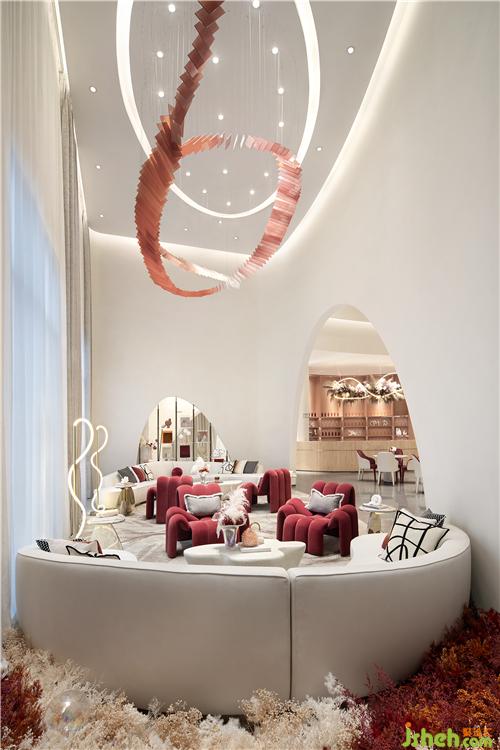 活力的赤紅作為點(diǎn)綴,以抽象的花瓣形態(tài)傳遞花海的繁盛意境,引入“花語(yǔ)春色”的詩(shī)意體驗(yàn),寓意城市的復(fù)蘇寓意,營(yíng)造一種安靜、歲月靜好的體驗(yàn)感武漢售樓處設(shè)計(jì)。