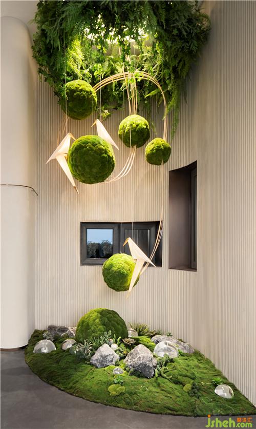 穿過(guò)過(guò)道展開(kāi)生活新篇章,植物圓球裝置以跳躍的色彩與生活共舞,簡(jiǎn)約的空間中孕育著自然詩(shī)意,傳達(dá)未來(lái)生活的自然和諧與美好。