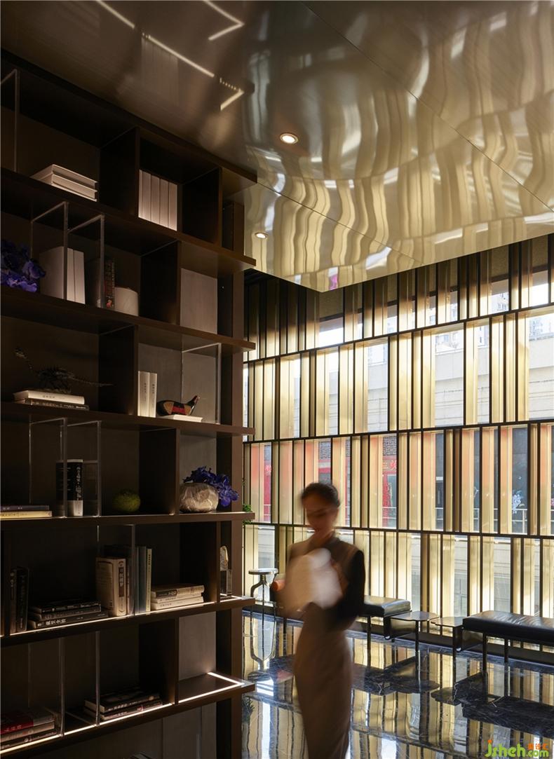 古銅色書架與落單臺(tái)呼應(yīng),同時(shí)作為兼具空間轉(zhuǎn)換的物件,區(qū)分開大堂/半包空間與包廂區(qū)域,兼?zhèn)鋵?shí)用與美學(xué)的功能。