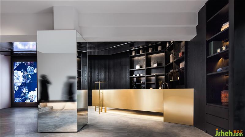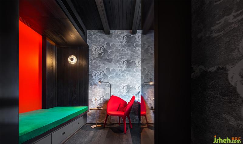 整個區(qū)域以黑色打底,其間置入一抹鮮明,如黃色座椅,在光線的輔助下,沖突也和諧。