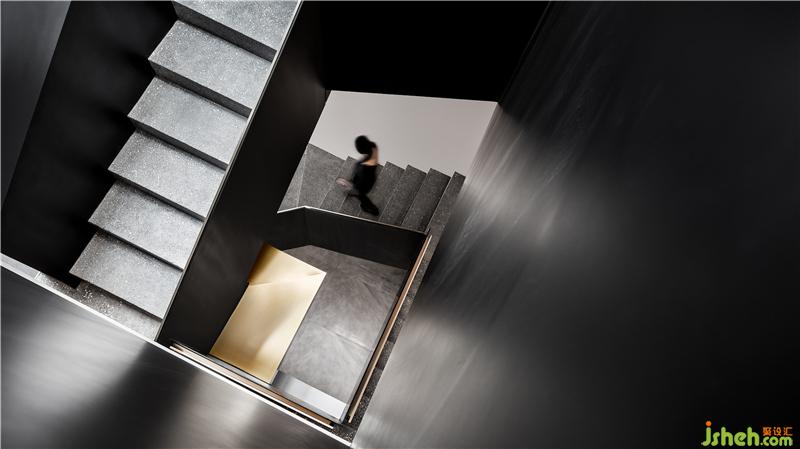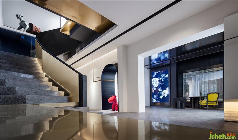 在二樓和三樓之間還置入了懸空的紅色箱體,作為收尾。整個空間變得有意思起來:金屬、石材、布藝,私密與開放兼具,營造一種極致的美學體驗。