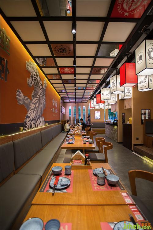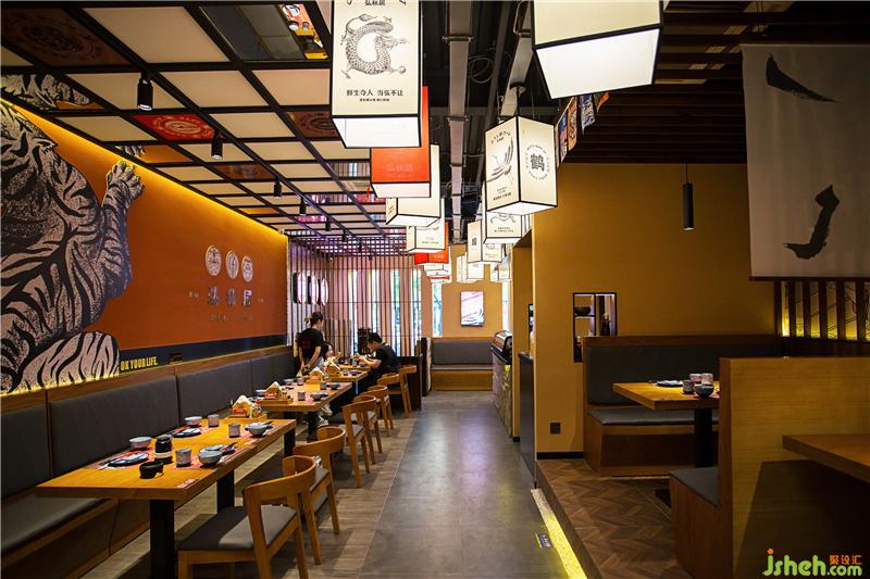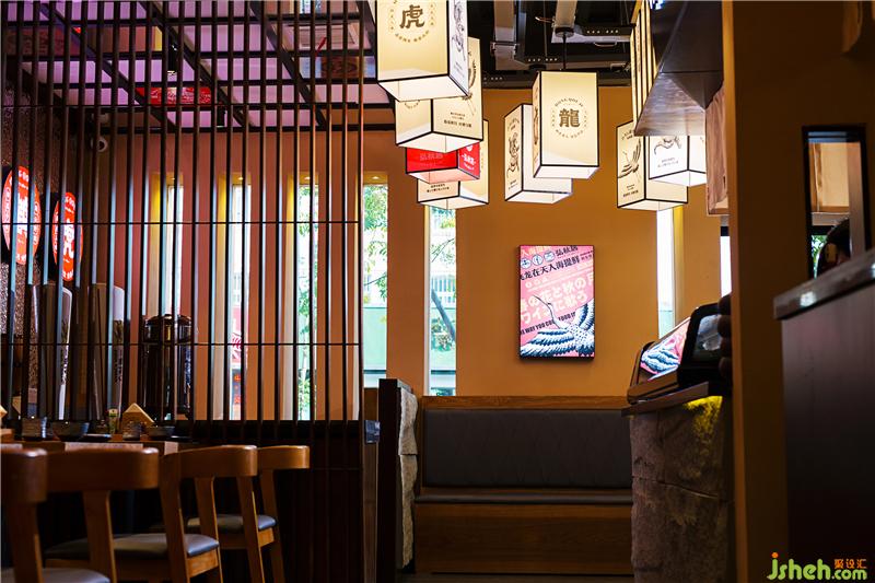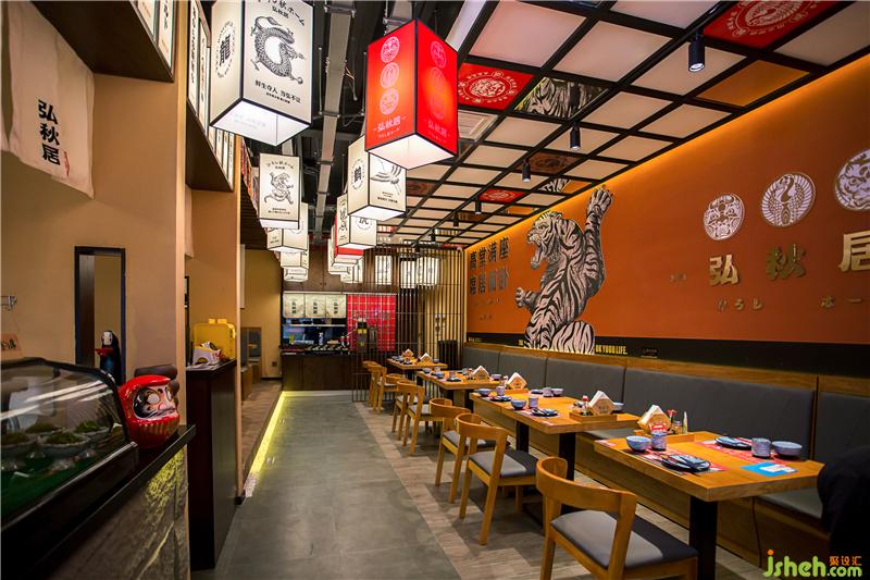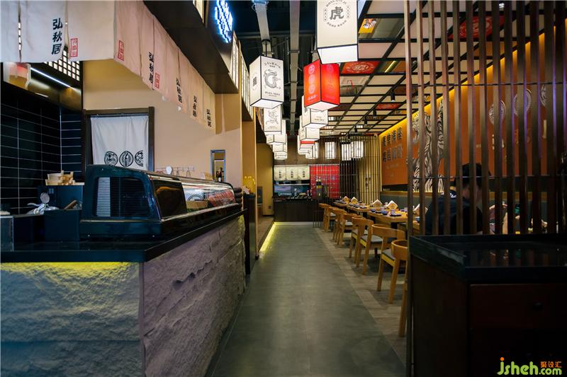 刺身區(qū)灰色墻磚和吧臺石皮俏皮不失端莊。入口就餐區(qū)背景墻運用鉆點紋不銹鋼作為載體背景,增添現代氣息,墻面點綴“龍鶴虎”燈箱,體現弘秋居文化。頂面潮流感的燈籠、吊旗掛飾,為空間增添氛圍。