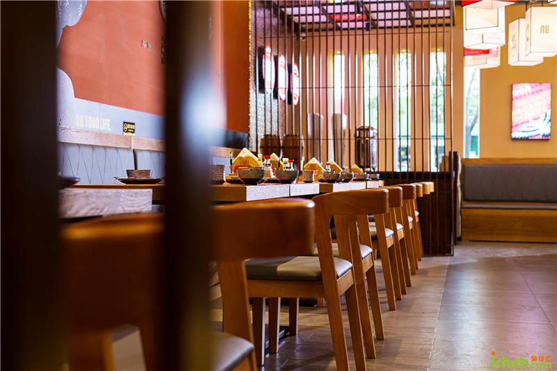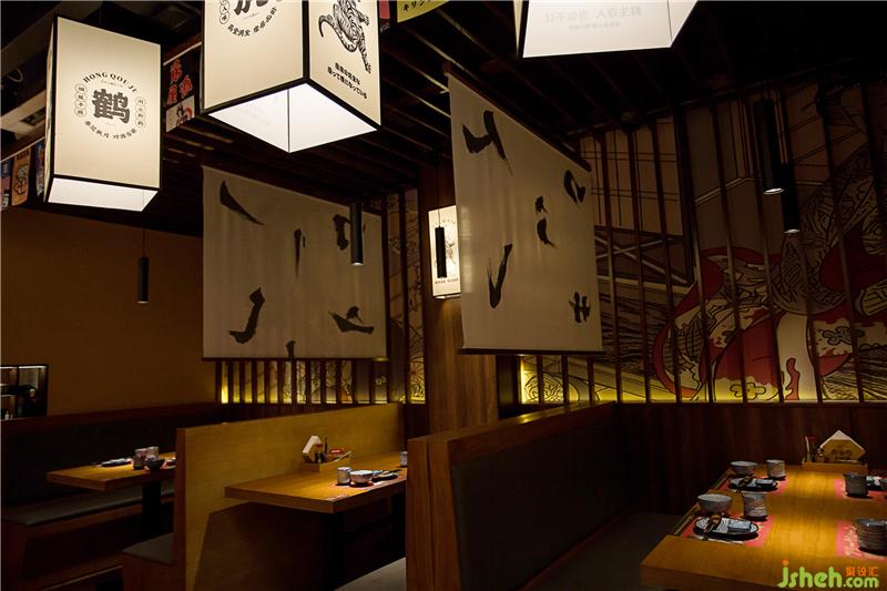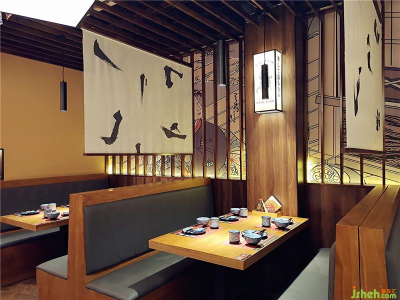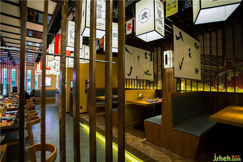 抬高就餐區(qū)墻面木格柵延伸至頂面,營造日式氛圍,浮世繪壁畫若隱若現,增添幾分神秘,座位之間布簾增加私密感同時,布面筆觸為“弘秋居”偏旁部首,處處都在渲染弘秋居文化氛圍。