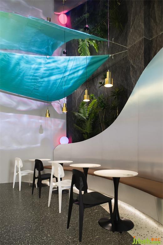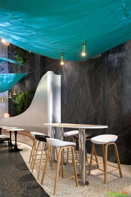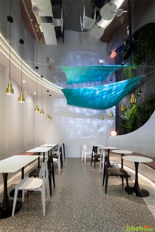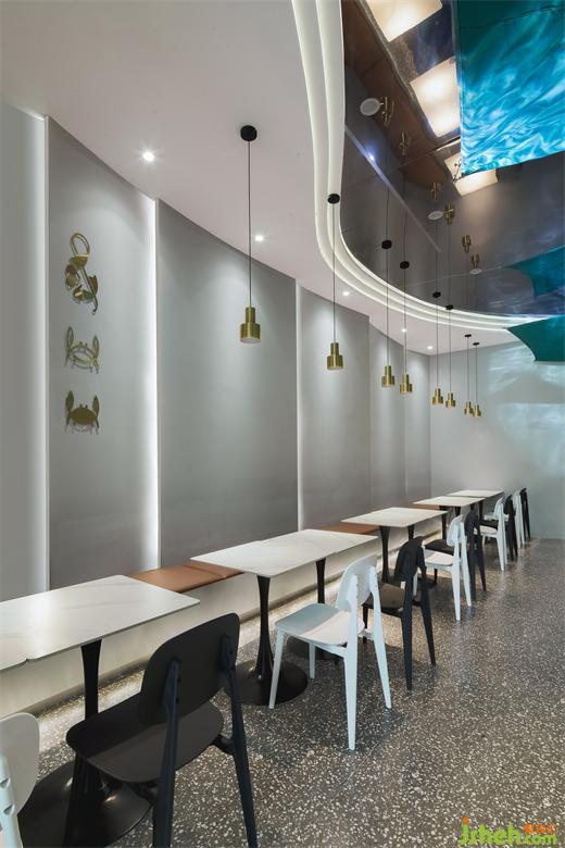整個外門面以海水藍為品牌色,呼應(yīng)海洋文化。由于門楣較大,所以未做過于繁雜的造型,材料以米白色肌理漆為底,簡約大氣,米線店設(shè)計重點突出品牌LOGO。整個門頭抓人眼球,十分醒目。
